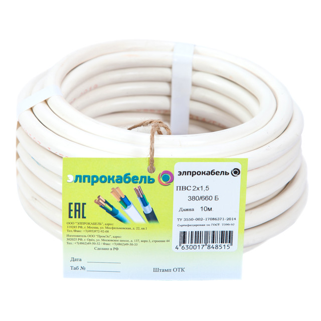кабель ПВС ЭлПроКабель гибкий круглый 2х1,5 ГОСТ 10м белый
