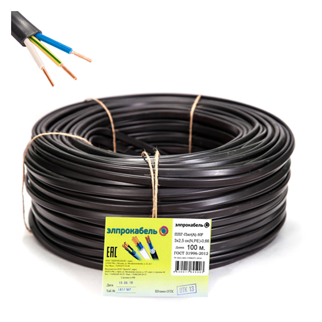 кабель ППГп-нг(А)-HF ЭлПроКабель твердый плоский негорючий безгалогенный 3x2,5 ГОСТ 100м черный